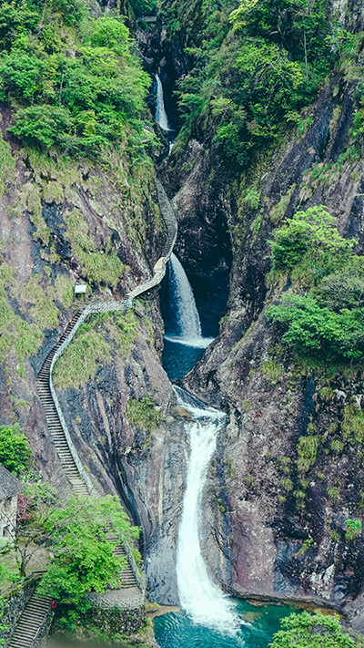 沿着百丈漈的台阶一路向下,壮观的瀑布逐渐映入眼帘,百丈漈瀑布似银河倒泻,如云如烟如雾,阳光直射峡谷。时而水流奔腾,飞流直下;时而溪水潺潺,鸟语花香;时而有彩虹挂壁,如雨水般迎面飘来;时而景廊峰峦起伏,飞瀑泻玉步步是景,美不胜收。加之奇峰峭壁、奇洞怪潭和以明代古迹为主体的人文景观,整个景区集奇峰异石、山光水色,融自然人文景观于一体。