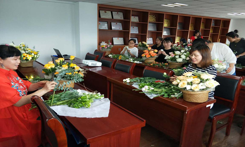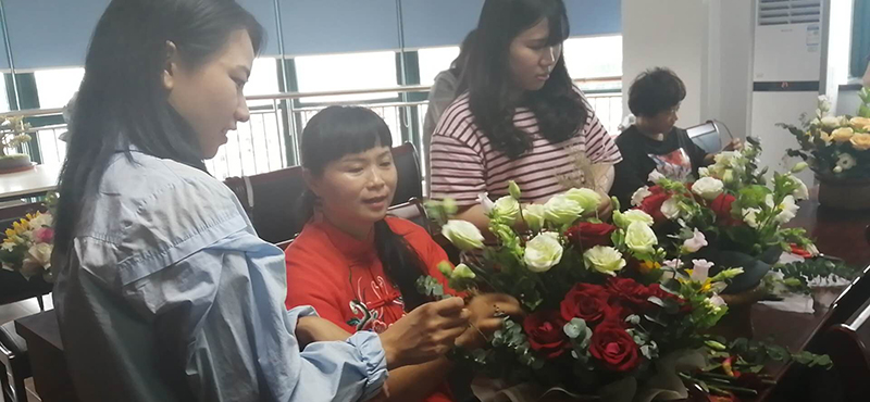 此次花艺活动特别邀请到省花艺协会理事、金华市花协副会长、金华市技术能手、金职院及市总工会长期合作花艺老师、从业21年的上品花店店主李爱玲老师,为大家现场授课。李老师讲解了插花艺术的基本知识、插花造型、器具、色彩应用及花的品种等方面的知识,并指导大家根据授课内容和自己的审美搭配出美丽的花束。