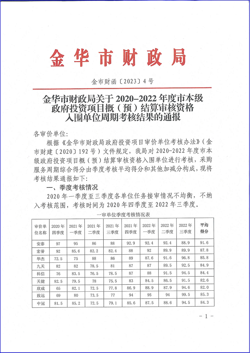 四、入选金华市财政局公布2020-2022年度市本级政府投资项目概(预)结算审核资格入围单位优秀名单: