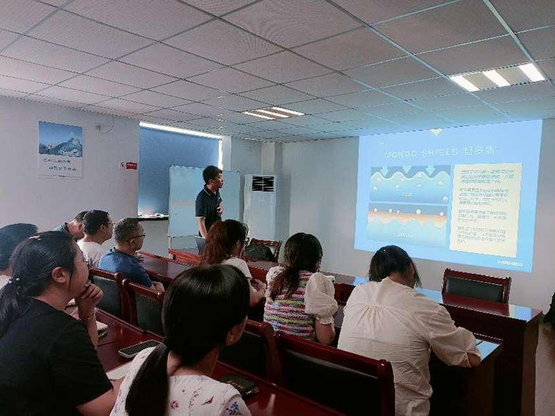 会上,代理商针对盟多品牌中的橡胶地板、PVC地板及操场塑胶地面卷材等进行了详细介绍,其中特别对PVC地板这类新型材料的生产、加工工艺做了展开式讲解,并阐述了其相对于传统材料在耐磨、抗压和防火等性能上的优势。同时,针对性能的不同,详细列举了材料等级以及与之对应的价格区间,让大家对此类材料有了更为系统和全面的认知。