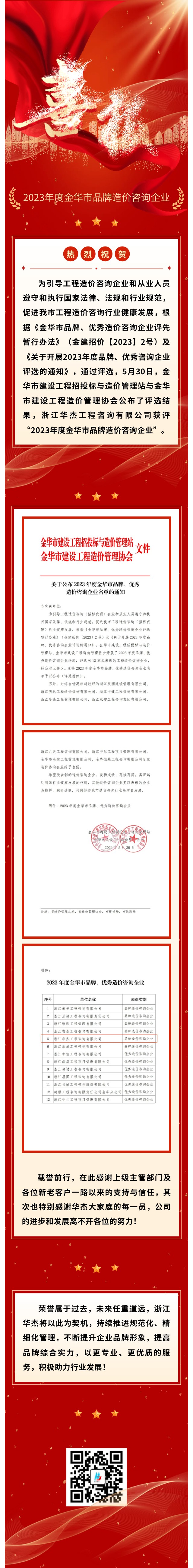 浙江华杰工程咨询有限公司获评“2023年度金华市品牌造价咨询企业”荣誉称号